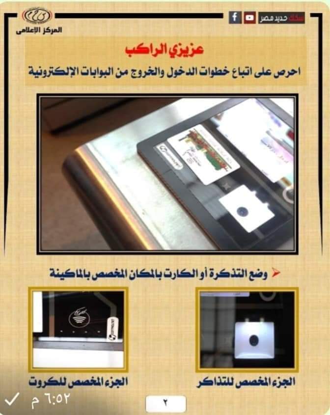 ناشدت الهيئة القومية لسكك حديد مصر الركاب بضرورة الاحتفاظ بتذكرة القطار حتى محطة الوصول، حتى يتم السماح لهم بالمرور من خلال البوابات الإلكترونية أو بعد اطلاع الكمساري المتواجد بأبواب المحطات على تذكرة السفر سواء للدخول أو الخروج من المحطات.