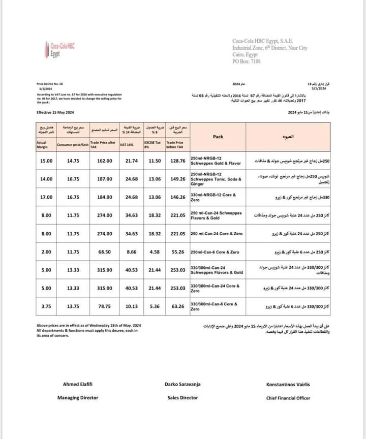 ومن ناحيته، صرح حازم المنوفي عضو شعبة المواد الغذائية بالغرف التجارية ، أن شركة كوكاكولا مصر أرسلت للتجار قائمة جديدة تتضمن أسعار شويبس بأجمالي 9 منتجات زجاج غير مرتجع وكانز.