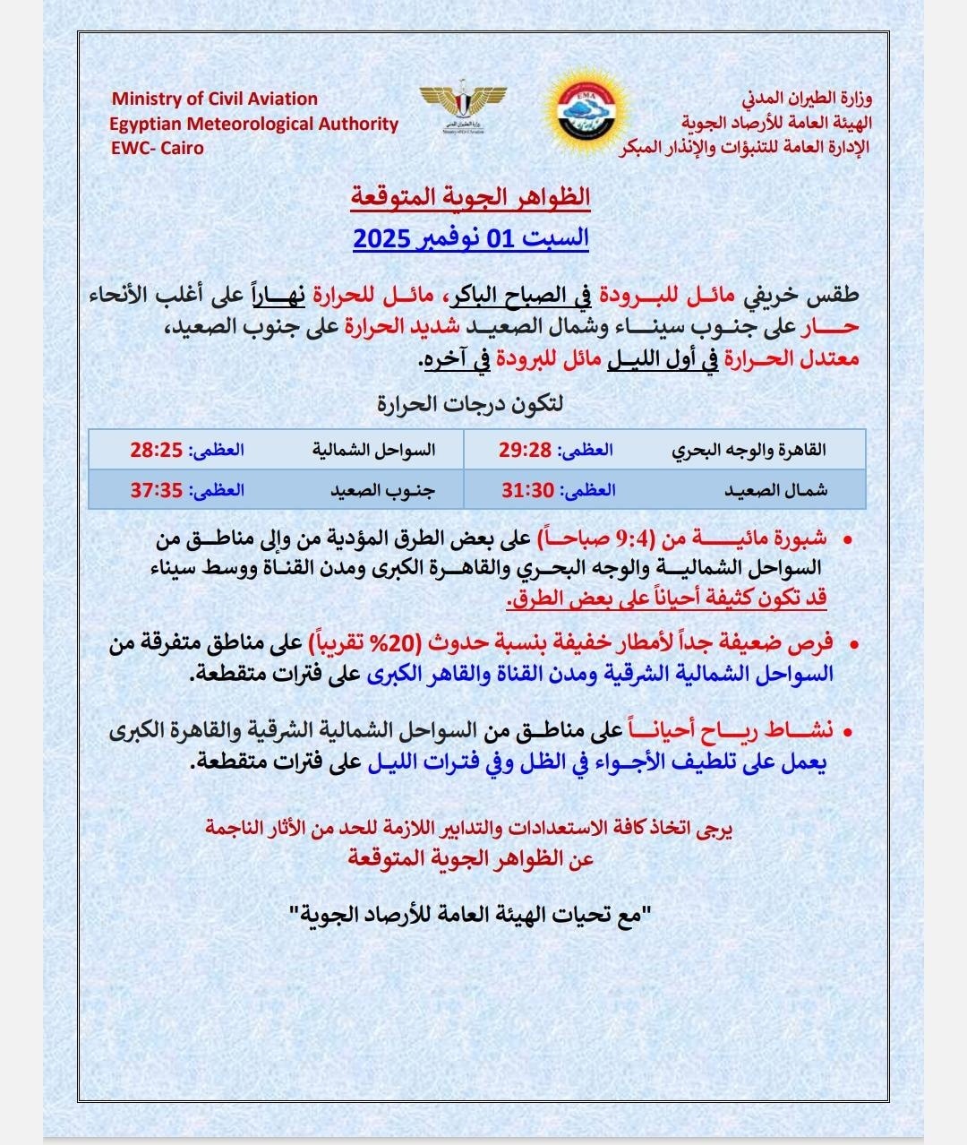 كشفت هيئة الأرصاد الجوية، عن توقعاتها لحالة الطقس المتوقعة، السبت 1 نوفمبر 2025، الذي يوافق افتتاح المتحف المصري الكبير، المقرر انطلاقه بحضور الرئيس عبدالفتاح السيسي و79 وفدًا رسميًا من دول عربية وأجنبية.