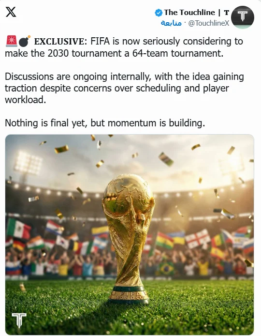 كشفت تقارير صحفية عن توجه داخل الاتحاد الدولي لكرة القدم «فيفا» لدراسة مقترح غير مسبوق يقضي بزيادة عدد المنتخبات المشاركة في بطولة كأس العالم 2030 إلى 64 منتخبًا، بدلًا من 48 فريقًا المعتمدين بداية من نسخة 2026.